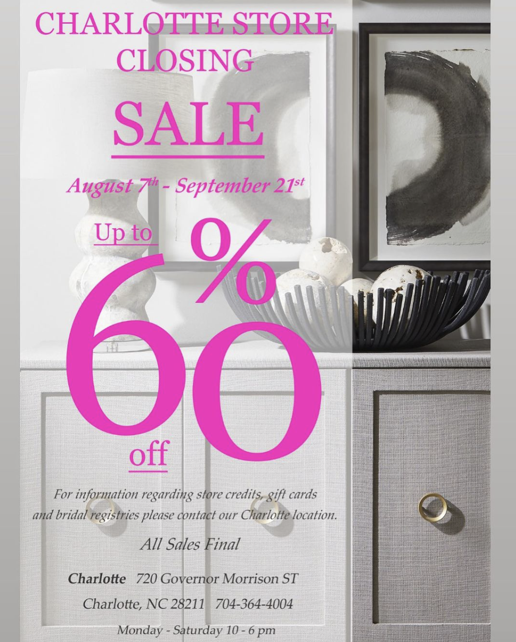 Their closing sale begins on Wednesday, Aug 7 with up to 60% off ~ most items will be 25% off. Sofas and sectionals will be 40% off and some brands only 20% off. Some items like Holiday ornaments will be 60% off.