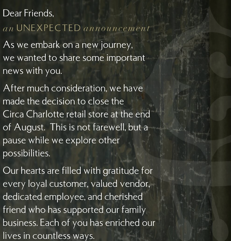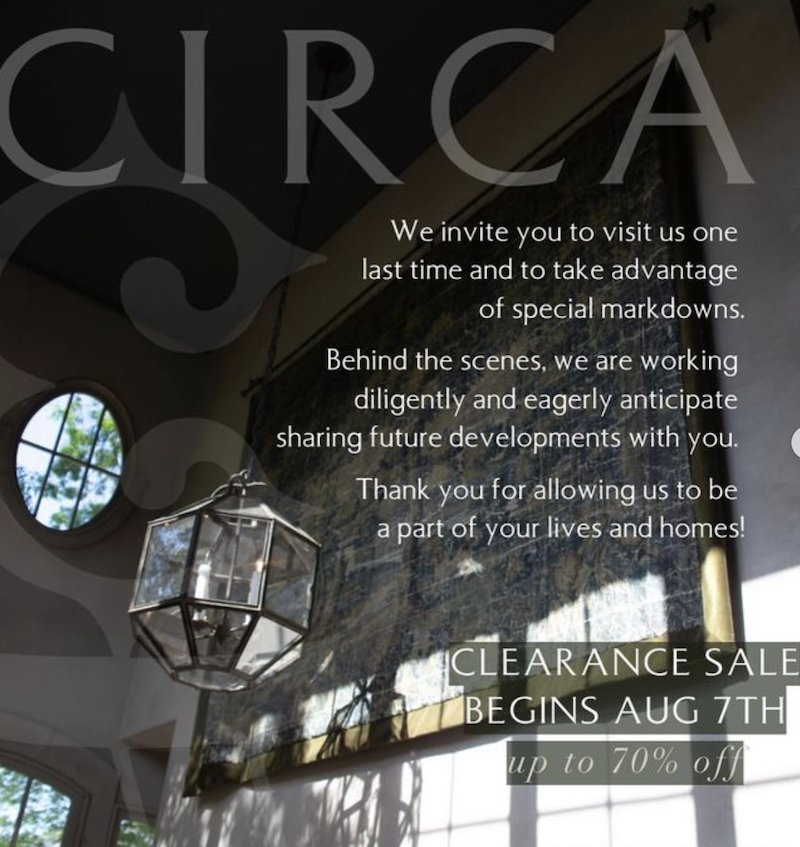 Wow. Days after BDJ announced their closing and sale, CIRCA announced their closing as well. Their sale will begin on Wednesday, Aug 7 with up to 70% off, in the same Morrison shopping center on Colony & Fairview as BDJ. The company will continue to sell via their online site as well as offer its interior design services.