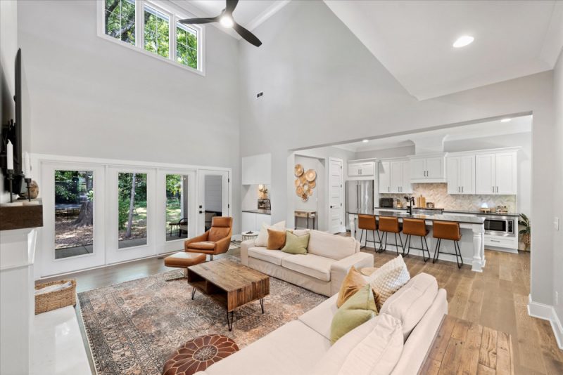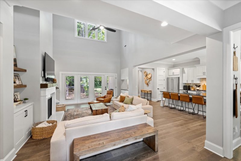 The great room offers a gas fireplace, built in cabinetry, and a wall of windows looking out onto backyard.