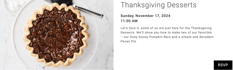 Over at Williams Sonoma, their Thanksgiving Open House from November 15-17 is the perfect chance to view product demonstrations and tastings of Thanksgiving dishes. Join their Thanksgiving Desserts demonstration where you’ll learn to make pumpkin bars and pecan pie.