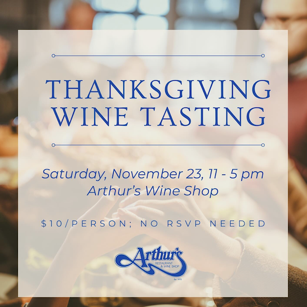 Which wine pairs best with turkey? What about pumpkin pie? Find out at Arthur’s Thanksgiving Wine Tasting of hand-selected 12 wines that will be perfect for your Thanksgiving celebration. $10/person, no reservations needed.