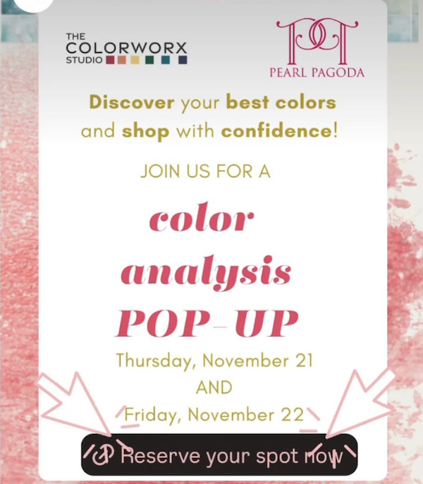 Color Analysis Pop Up at Pearl Pagoda in Montford Thurs & Fri 11/21 and 11/22 Mini session to figure out your color sweet spot hosted by @thecolorworxstudio, DM the Pearl Pagoda asap to reserve your spot.