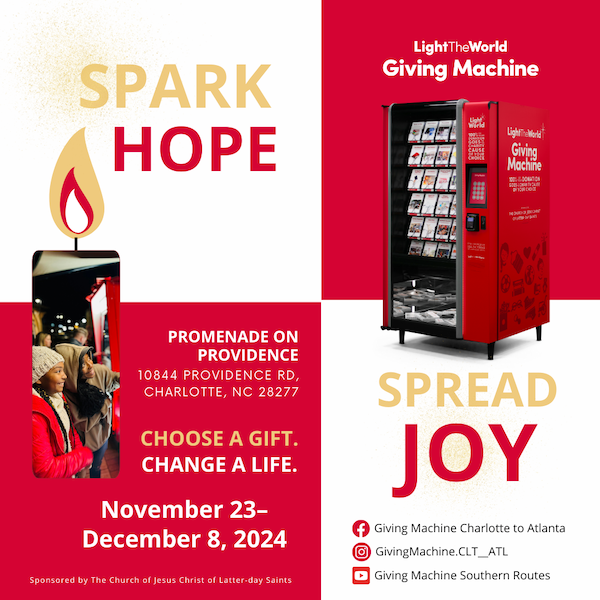 The Light the World Giving Machines are at Promenade on Providence through December 8th. These unique giving machines offer a fun and memorable way to help those in need and perform an instant act of kindness. The Giving Machines also make a great visual aid in both storytelling and teaching kids about giving. Prices for items in the Giving Machines range from $5 to $175. This year’s local nonprofit beneficiaries are: