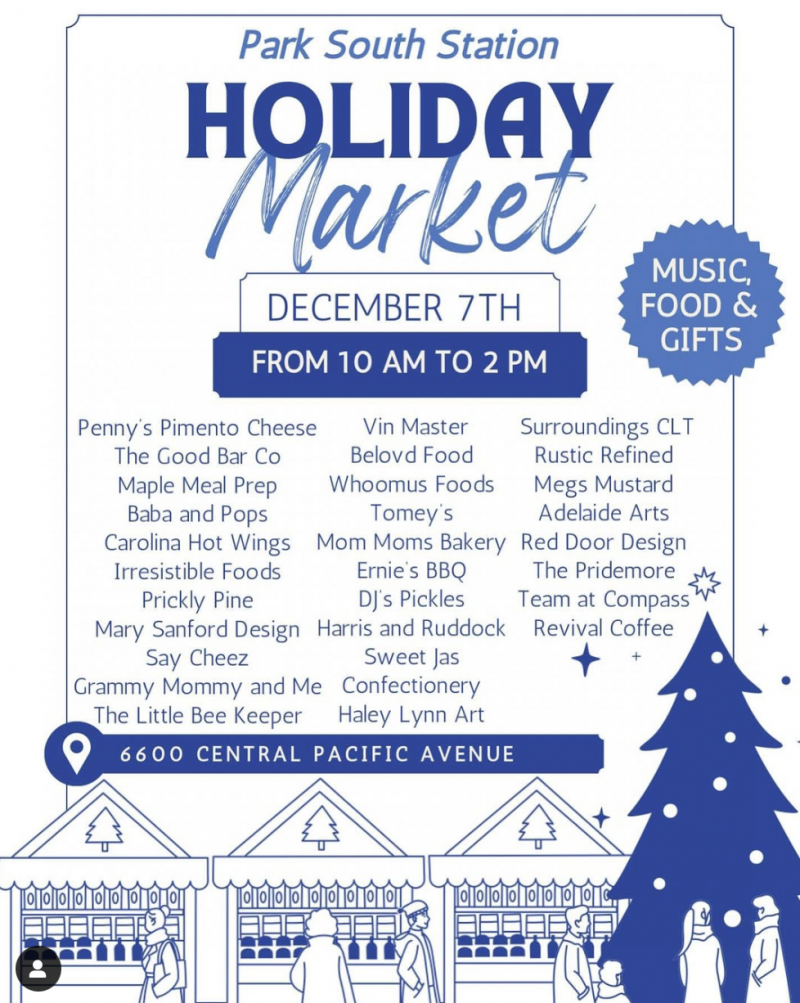 The Uptown Holiday Market runs Wednesday, December 4, to Saturday, December 7 on Levine Avenue of the Arts (the one block between S. Tryon and S. Church between Mint Museum Uptown and the Bechtler). 24 vendors and holiday activations.