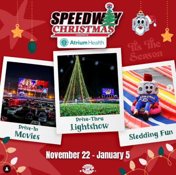 Speedway Christmas is back at the Charlotte Motor Speedway. The 15th season of the Southeast’s largest drive-thru holiday light show will feature more than 5 million lights on a four-mile course. The show is open 6-10 p.m. rain or shine and features synchronized lights-to-music on 101.3 FM plus drive-in movies on the gigantic Speedway TV every Thursday through Sunday night until Christmas.
