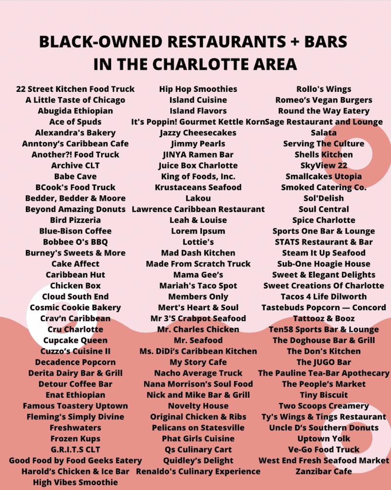 Insta account @besteatscharlotte compiled a fantastic resource of local Black-owned eateries around town, below. Support these local entrepreneurs and businesses this month and every month!