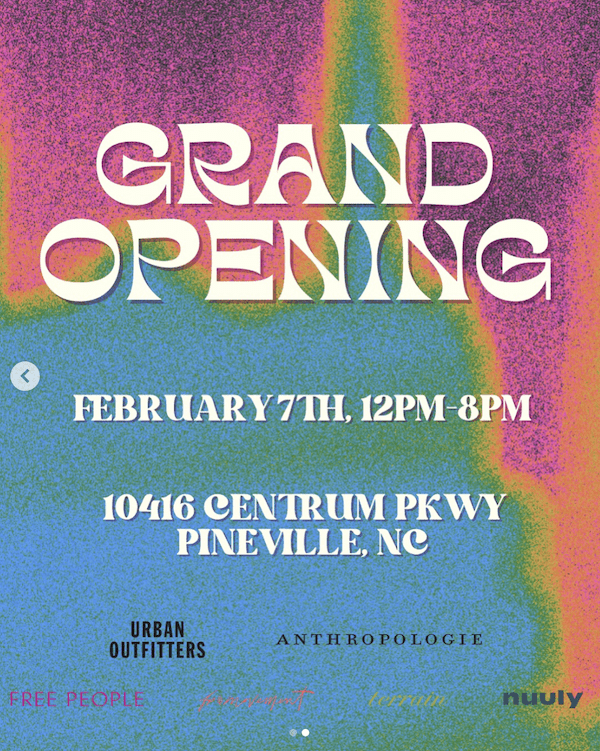 For lovers of Anthropologie, Free People, Urban Outfitters, and Nuuly, this new concept from parent company URBN is music to the ears. Or closet. Selling overstocks, returned goods, slightly worn, all at 50-60% off retail. The new Pineville store, opening this weekend, is the company’s 4th. NOTE: No dressing rooms, no returns.
