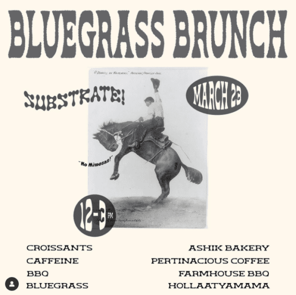 Start your day at Substrate for a party on the porch: brunch style. Coffee, croissants, BBQ, and bluegrass will fill the air starting at noon. Plenty of wine will also be available to enjoy.