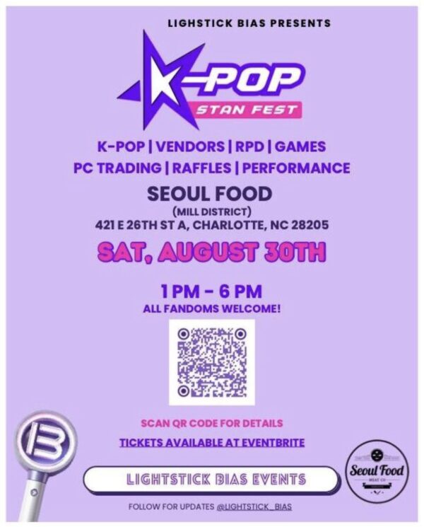 The first ever K-Pop Festival will be held on August 30th, at Seoul Food, located at 421 E 26th Street A, Charlotte, NC. Expect music, dancing, merch, DIY, stations, and more. All ages are welcome at this free festival celebrating all things K-Pop.