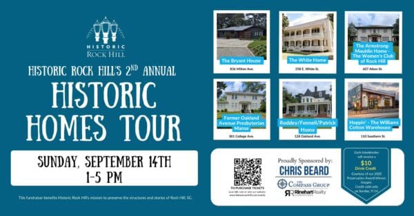 Join Historic Rock Hill for the 2nd annual Historic Home Tours this Sunday, starting at 1p.m. Tours will begin at the White Home where you’ll pick up an entrance sticker, map and informational booklet, and then you may proceed through the homes at your own pace. At each stop you’ll learn more about the fascinating history of the home, and a bit about Rock Hill’s history, too.