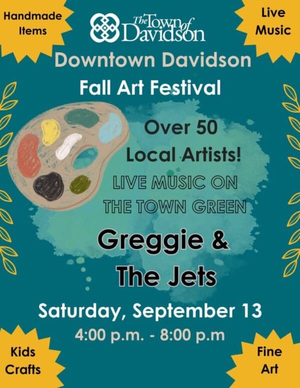 Over 50 participating local artists will be set up in Historic Downtown Davidson. In addition to the fine art, attendees will be able to purchase handmade gifts, food at local restaurants, and live music. Greggie & The Jets (Elton John Tribute Band) will perform on the Green (119 S. Main Street) at 6:00 p.m.
