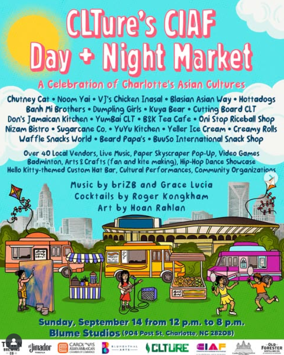 CLTure, Blumenthal Arts, and the Carolinas Asian American Chamber of Commerce are teaming up for the free Charlotte International Arts Festival Day + Night Market at Blume Studios’ festival grounds (1001 S. Clarkson Street) in The Iron District. The event will feature 25+ food and drink vendors, 40+ local makers, live performances, art displays, vintage video games (including a Tekken 8 tournament), caricatures, and specialty cocktails.