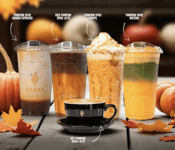 The seasonal menu at Haraz brings cozy spices, rich flavors and fall vibes. Enjoy a pumpkin spice shaken espresso, a pumpkin spice frappe, a pumpkin spice matcha, or a classic pumpkin spice latte available hot or iced next time you stop in.