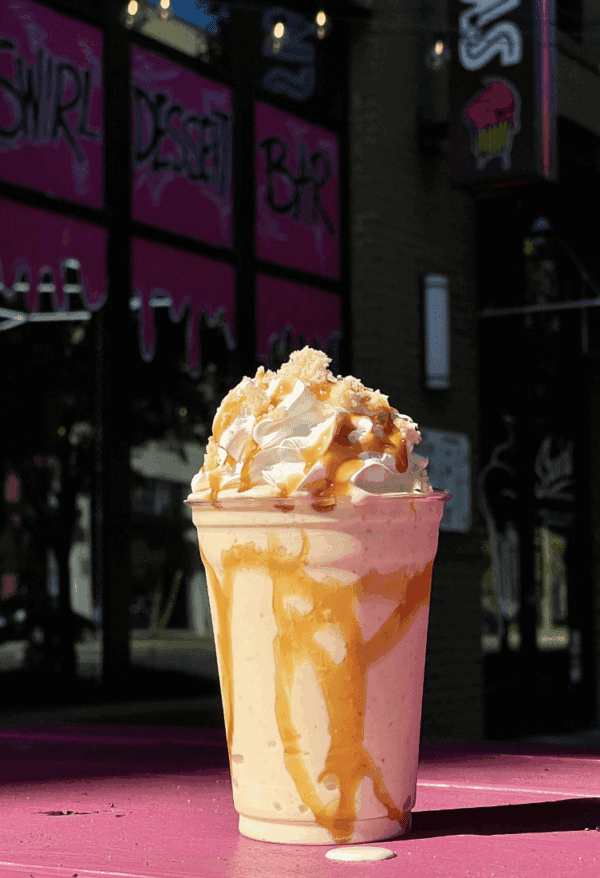 Try the pumpkin pie milkshake at SWIRL for a delicious fall treat. It’s a vanilla milkshake blended with pumpkin pie, buttery pie crust and caramel sauce topped with whipped cream.