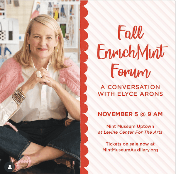 Elyce Arons, co-founder of Kate Spade and co-founder and CEO of Frances Valentine, will come to Charlotte on Wednesday, November 5, 2025 to address members of the Mint Museum Auxiliary and their guests in the annual Fall Enrichment Forum at the Mint Museum Uptown.