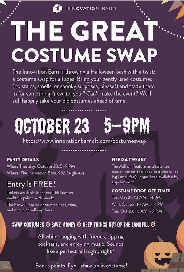Bring your gently used costumes and trade them in for something “new-to-you.” Sip on spooky cocktails, enjoy tasty bites, dance to the music, and keep perfectly good costumes out of the landfill. Bonus: The Mill will be on hand for quick alterations so your fit is frightfully perfect. Don’t miss Charlotte’s most eco-friendly Halloween party. Costumes encouraged.