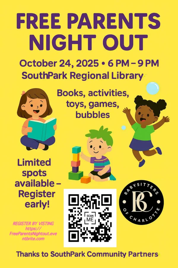 Babysitters of Charlotte is bringing a night of fun to SouthPark Regional Library! Parents can enjoy a little “me time”, whether that means dinner, shopping, or just relaxing, while kids dive into an evening full of stories, games, and activities. It’s the perfect mix of fun for the little ones and a break for the grown-ups. Registration is required to join the fun.
