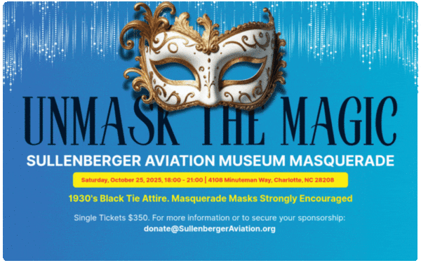 Unmask the magic with the Sullenberger Aviation 2025 Museum Masquerade. The event will be a 1930s Black Tie Affair, with masquerade masks strongly encouraged. Highlights will include a seated dinner, live jazz & big band tunes, and a special guest appearance from Captain “Sully” Sullenberger.