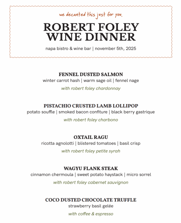 Decanted just for you, Napa at Stonecrest is hosting a Robert Foley Wine Dinner, complete with a delicious menu and all the wine to pair it with.