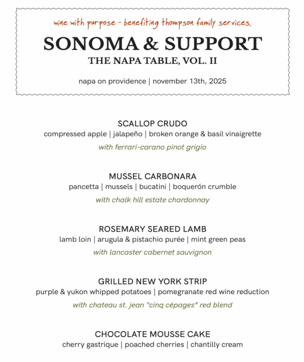 Napa on Providence is hosting an unforgettable evening of fine Sonoma County wines, curated pairings, and meaningful impact. Presented by Regions Bank, this intimate wine dinner blends the richness of Sonoma’s vineyards with a commitment to supporting Thompson’s mission of strengthening children and families. Savor each course, raise a glass, and be part of a night where purpose and community come together.