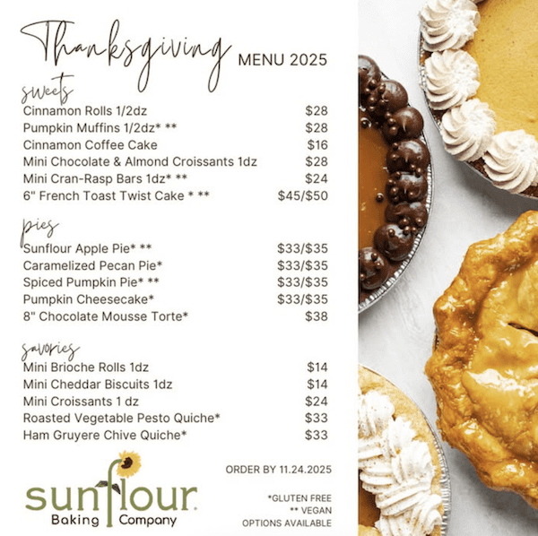 It’s never too early for pie – From pumpkin muffins to apple pie, Sunflour has a variety of fall-inspired Thanksgiving goods on this year’s menu.