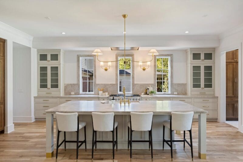 The kitchen features a flushed hood vent providing an unobstructed wall with three windows framed by seamless stone trim, while the wood paneled refrigerator / freezer wall creates a furniture-like focal point blending the kitchen and great room.