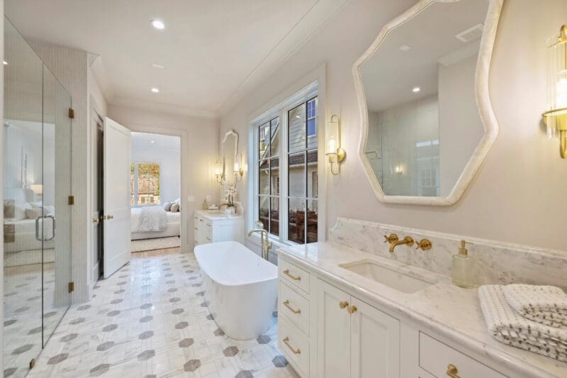 The main-level primary suite offers a spa-inspired bath with a zero entry glass shower.