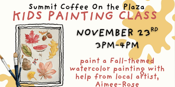 Local artist Aimee-Rose will be hosting a fall-themed Kids Painting Class at Summit Coffee on The Plaza. With step-by-step guidance from Aimee-Rose, kids will learn simple watercolor techniques while painting leaves, mushrooms, acorns, and other fun fall details. All supplies are provided, just bring your imagination.