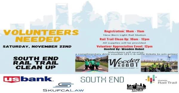 Spend your Saturday morning doing some good in the community at the Rail Trail Clean Up. Registration is FREE and will take place anytime between 10am-11am at the New Bern Light Rail Station. Small Groups will walk at their own pace & clean up trash along the Rail Trail & surrounding streets. Wooden Robot Brewery will host a Volunteer Appreciation Event, beginning at 12pm, to celebrate all of our volunteers’ efforts.
