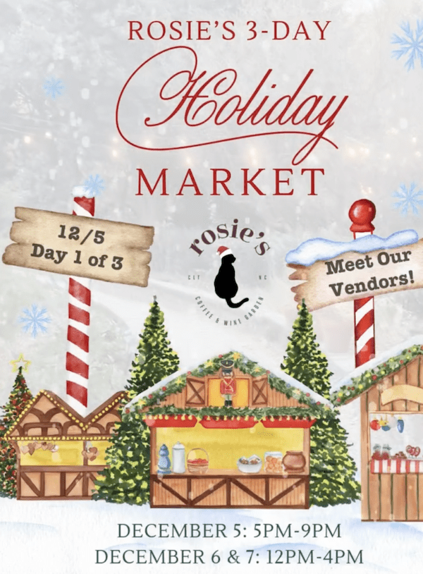 Rosie’s Wine Bar in NODA is hosting a 3-day Holiday market starting Friday evening, December 5 and running thru the weekend with different vendors throughout.
