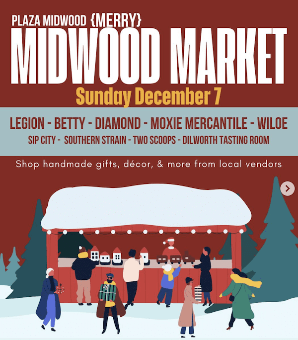 The Plaza Midwood Merry Market is Sunday, Dec 7, with vendors starting at 12 and the tree lighting, Santa and Santa photos at 6pm. 40+ Plaza Midwood businesses + vendors come together for a full day of community, shopping, and holiday cheer all throughout the neighborhood.