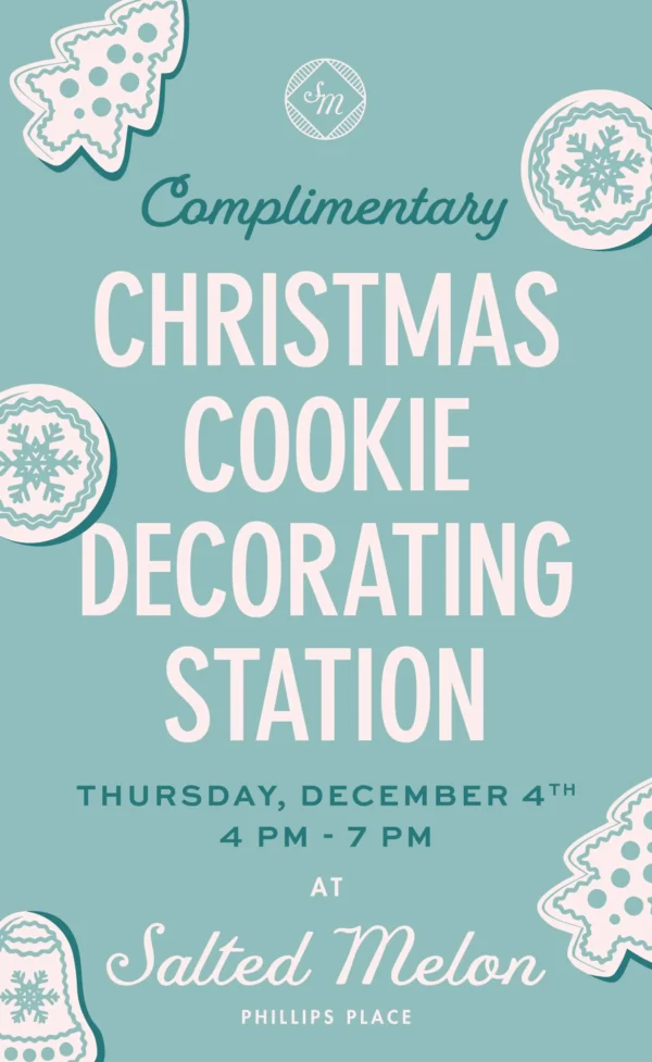 Join Salted Melon’s SouthPark location for a complimentary Christmas cookie decorating station during the annual Phillip’s Place holiday celebration & shopping stroll.