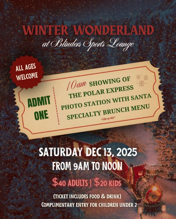 Blinders is transforming into a full-on Winter Wonderland for all ages, complete with snowy Santa photos and a 10 a.m. screening of The Polar Express. Guests can dig into a festive holiday brunch featuring pancakes, a bacon–egg–cheese wrap, and a breakfast flatbread. Plus mimosas, Bloody Marys, and spiked hot chocolate for the grown-ups.