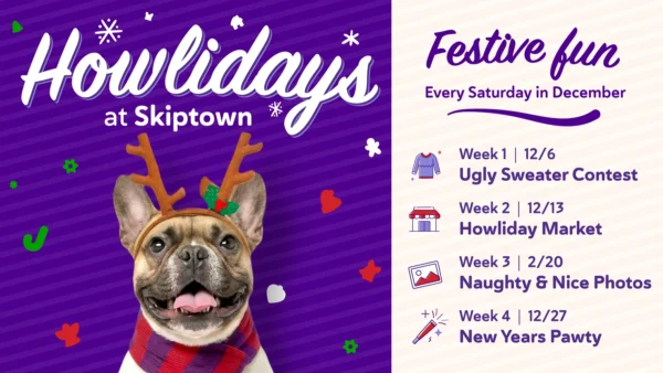 Skiptown is turning up the holiday cheer with Howlidays at Skiptown, a month-long lineup of festive Saturdays made just for pups and their parents. This weekend, visit the Howliday Market, a festive outdoor market starring local pet-friendly vendors, gifts, treats, and holiday shopping essentials for dogs and humans.