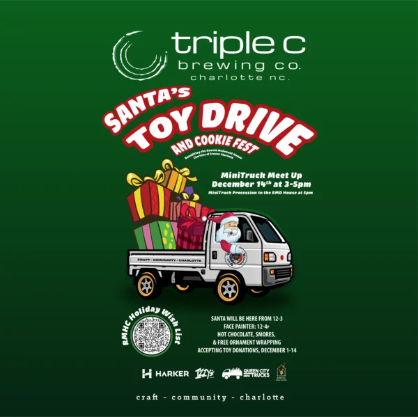 Triple C Brewing is teaming up hosting a Holiday Toy Drive benefiting Ronald McDonald House Charities of Greater Charlotte. New, unwrapped toys from the approved donation list can be dropped off at the taproom during regular hours from December 1–14, and Izzy’s will offer a free small one-topping pizza for each donation (one per family, per day). The drive wraps up on Sunday with a festive celebration featuring Santa from 12–3 p.m., face painting, hot chocolate, s’mores, kids’ crafts, and a decorated mini-truck meetup from 3–5 p.m.