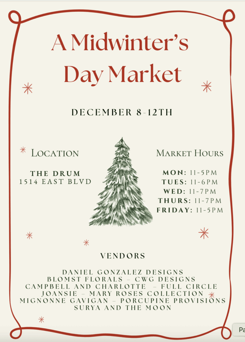 Fashion Designer Daniel Gonzalez and friends are hosting a holiday shopping pop-up featuring unique brands you won’t find at all the many area markets this season. Located on East Blvd in the old JJ’s, now called The Drum, which is a new event-hosting space from the folks at Porcupine Provisions.