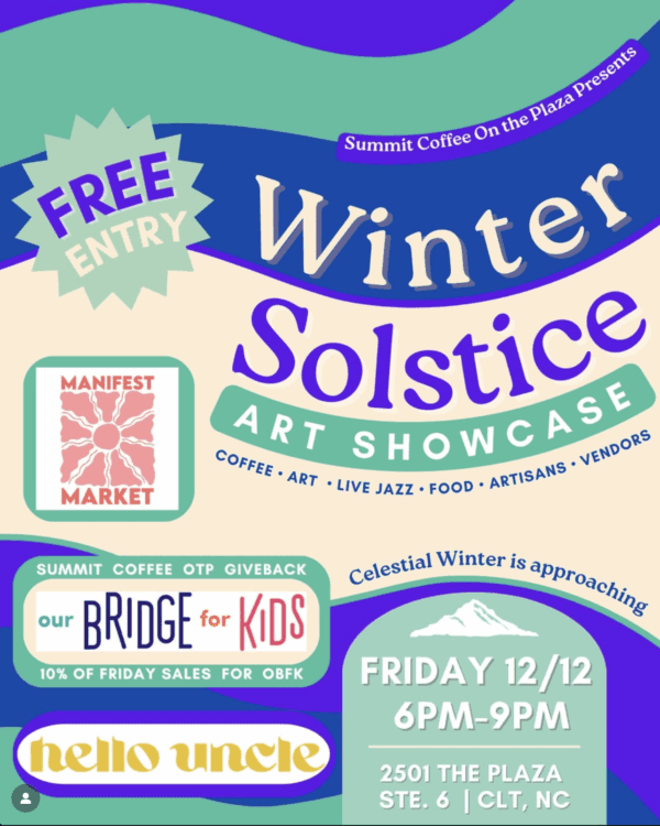 Summit Coffee on the Plaza is hosting a vibrant Art Showcase, bringing together local creators for an evening of creativity, community, and cozy winter vibes. Guests can sip their favorite drinks while browsing original works from Charlotte-based artists, meet the makers behind the pieces, and shop one-of-a-kind gifts just in time for the holidays. 10% of total Friday sales will be donated to Our Bridge for Kids.