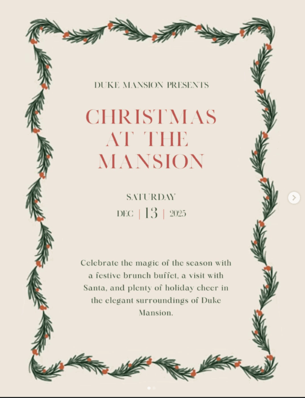 Step into the holiday season at Duke Mansion. On December 13, the mansion opens its doors for a day filled with festive cheer — photos with Santa, hot chocolate, sweet treats, and cozy holiday moments for the whole family. It’s one of the most magical days of the year, and they can’t wait to welcome everyone back. Tickets are available now.