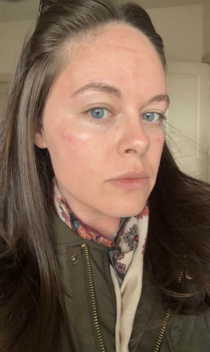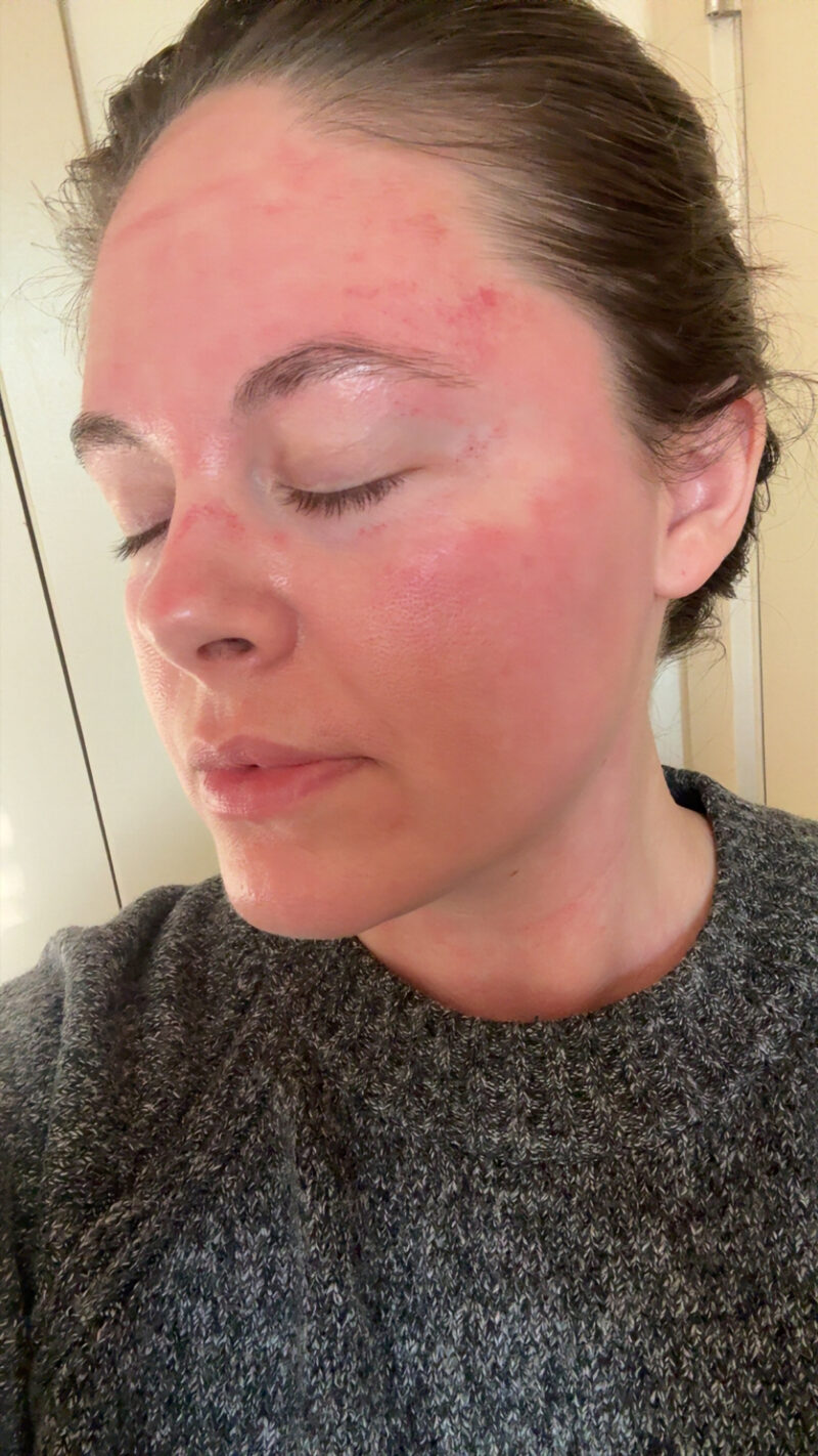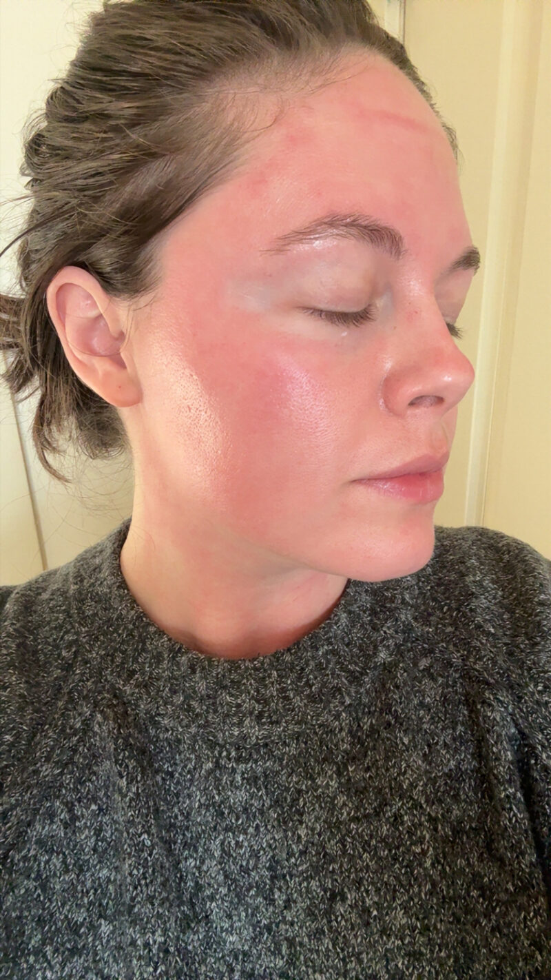 This is two hours after treatment. You can see the redness in (almost) full effect, but believe it or not, it doesn’t hurt here. By bedtime, my skin was feeling tighter and a little itchier, but no heat or discomfort. Some people experience a bit of a sunburn-like discomfort but I did not!