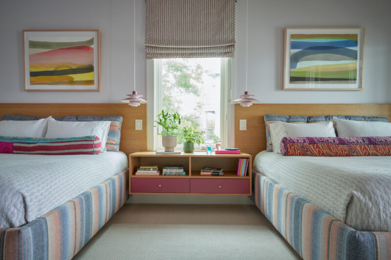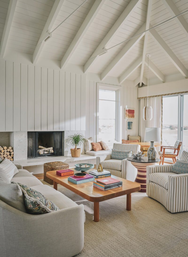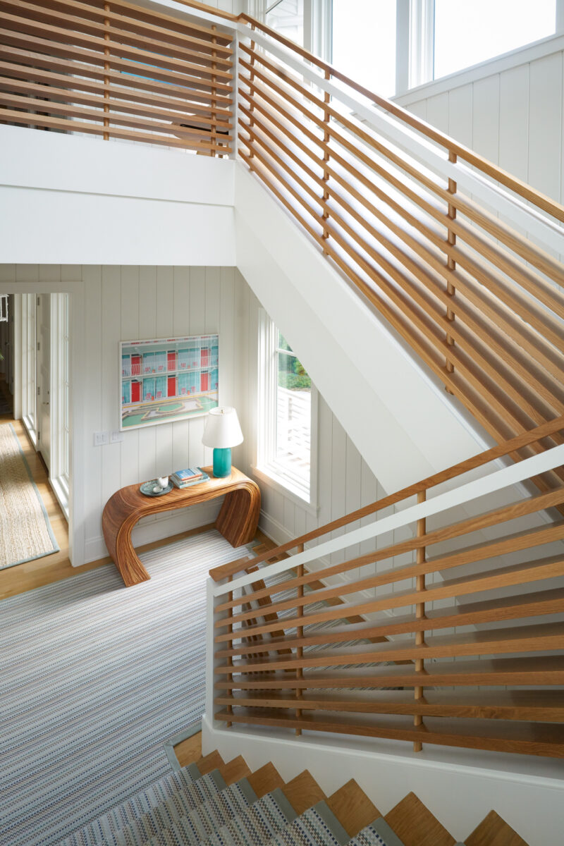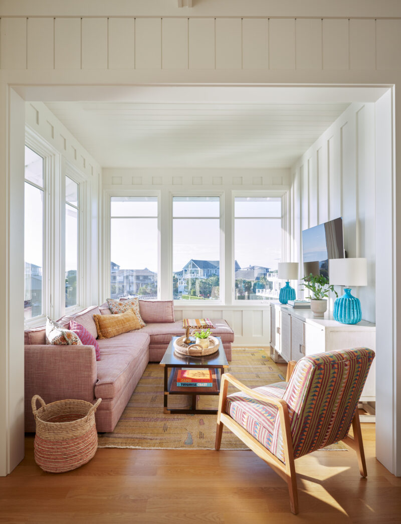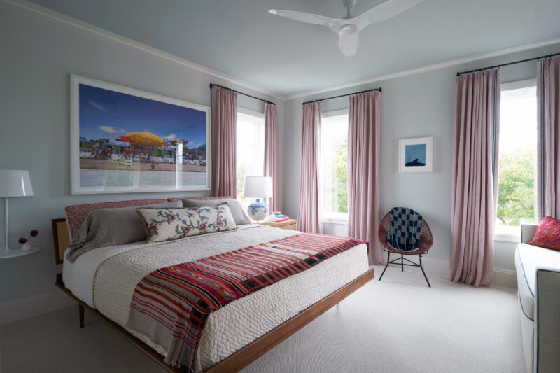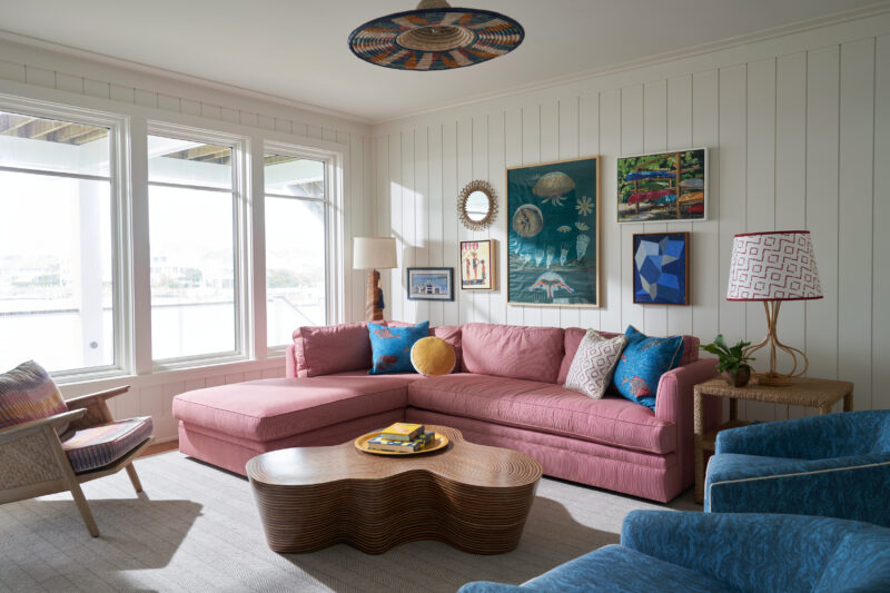 • The team pulled colors from the sound, like soft blues and sandy neutrals, into the home to create an atmospheric sense of calm. In more intimate moments you’ll find sunset-inspired hues like red, yellow and purple.