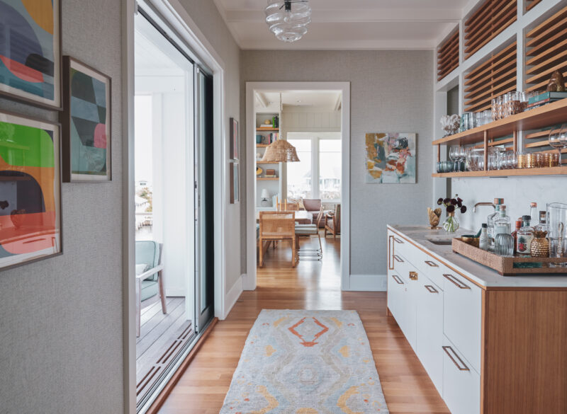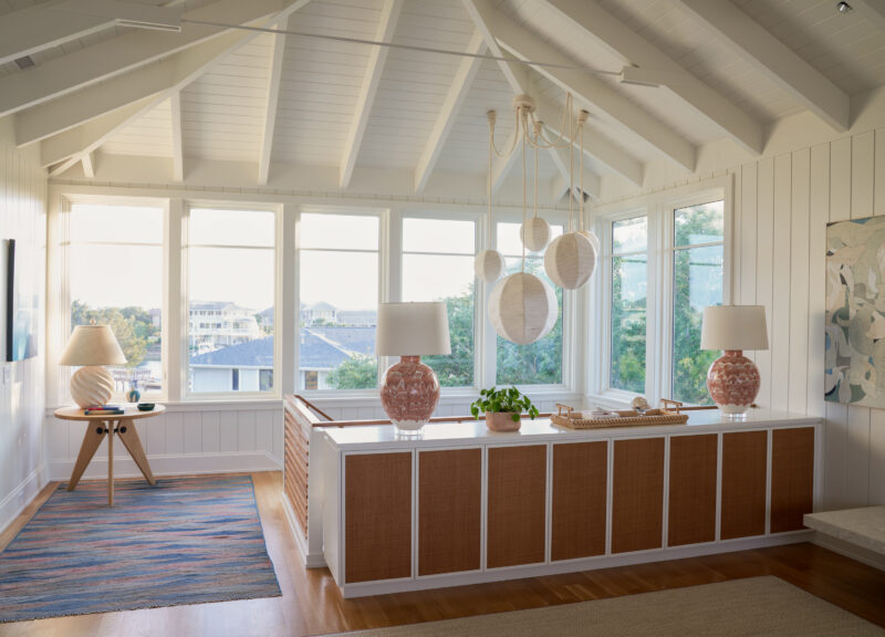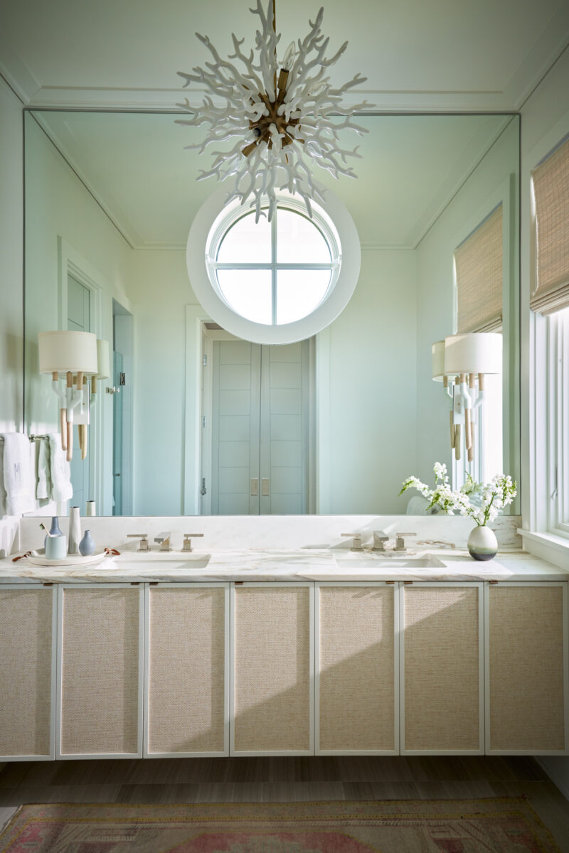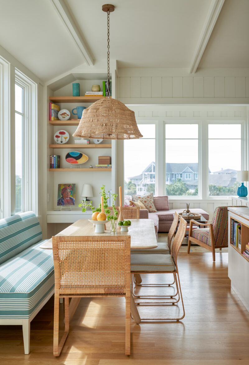 In the details: “The main living spaces stay calm and textured through materials like rope, rattan, grasscloth, caning, white oak, and even crushed shells—letting those quieter tones and natural elements set the mood,” Barrie says.